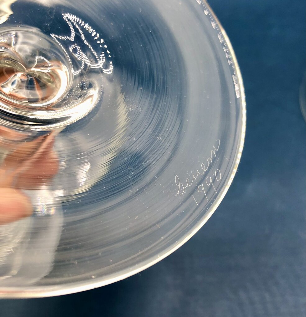 Sleek set of blown glass teardrop candlesticks made in 1990. The candlesticks are signed on the bottom by master glassblower Pete Severn of Chelsea, Michigan. Pete Severn was referred to as a “Master Scientific Glassblower” as he created glass components for scientists and engineers. He also made home decor and art glass pieces. The candlesticks are beautiful and quite reminiscent of a Danish Modern design style,