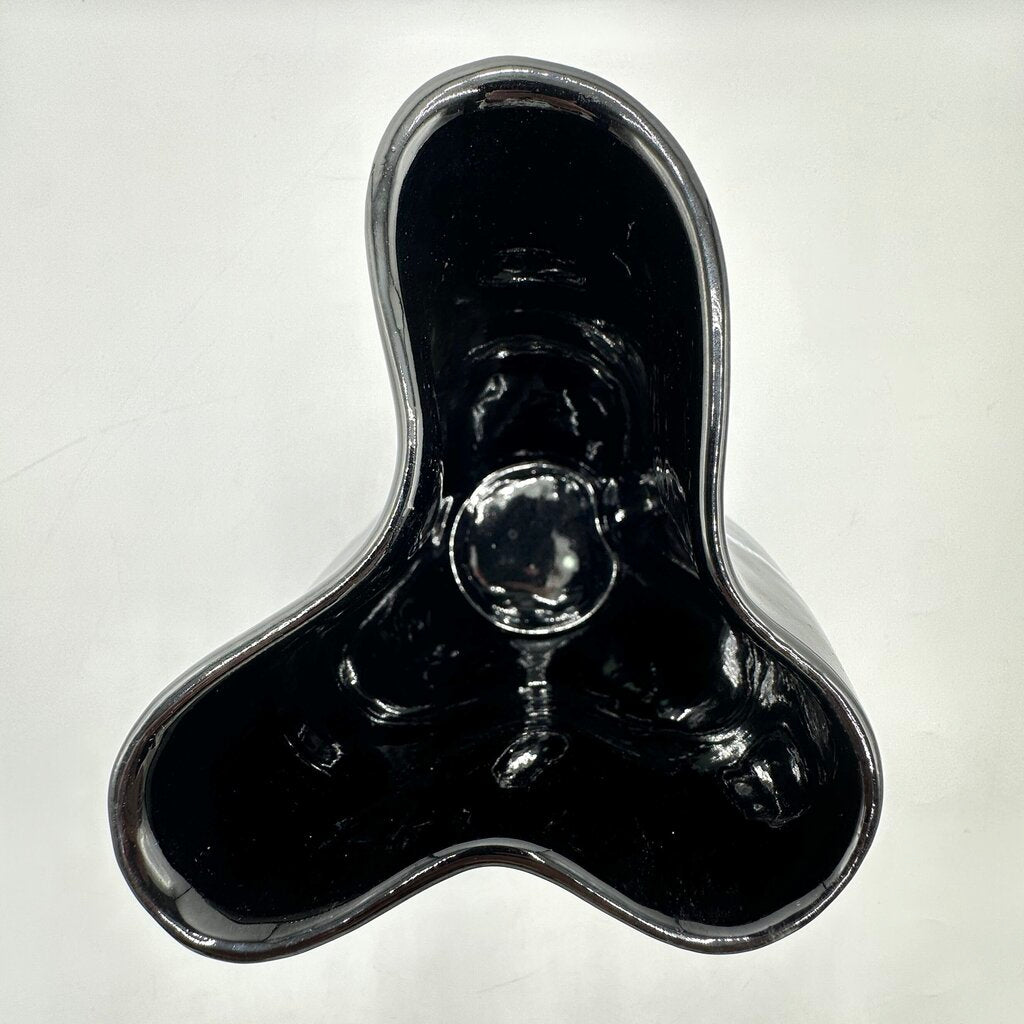 Beautiful Vintage Royal Haeger Art Pottery Vase, shiny black with a white and green drip glaze R1946. The vase is pinched into a triangular shape. It is 9” tall and in very good vintage condition, no chips, cracks or repairs. There is light chipping on the bottom rim, but that is not noticeable when the vase is displayed.