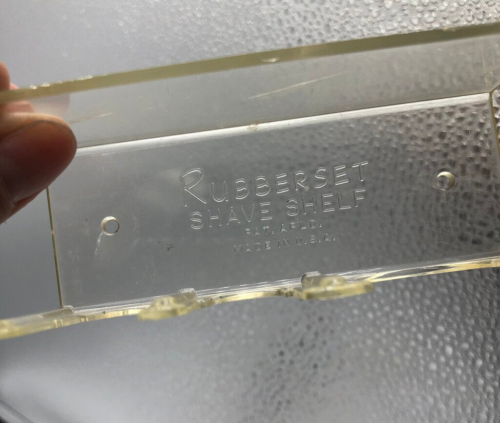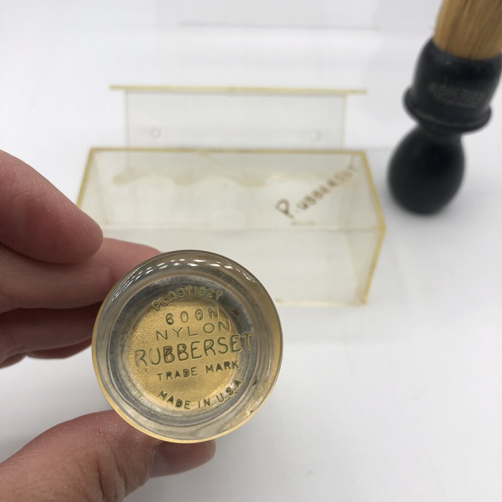 The clear handle 600N nylon brush measures 3 5/8”. It appears to have never been used. It includes a Rubberset acrylic case with shave shelf. Case shelf has a visible crack but it does not go through the acrylic (see photos).