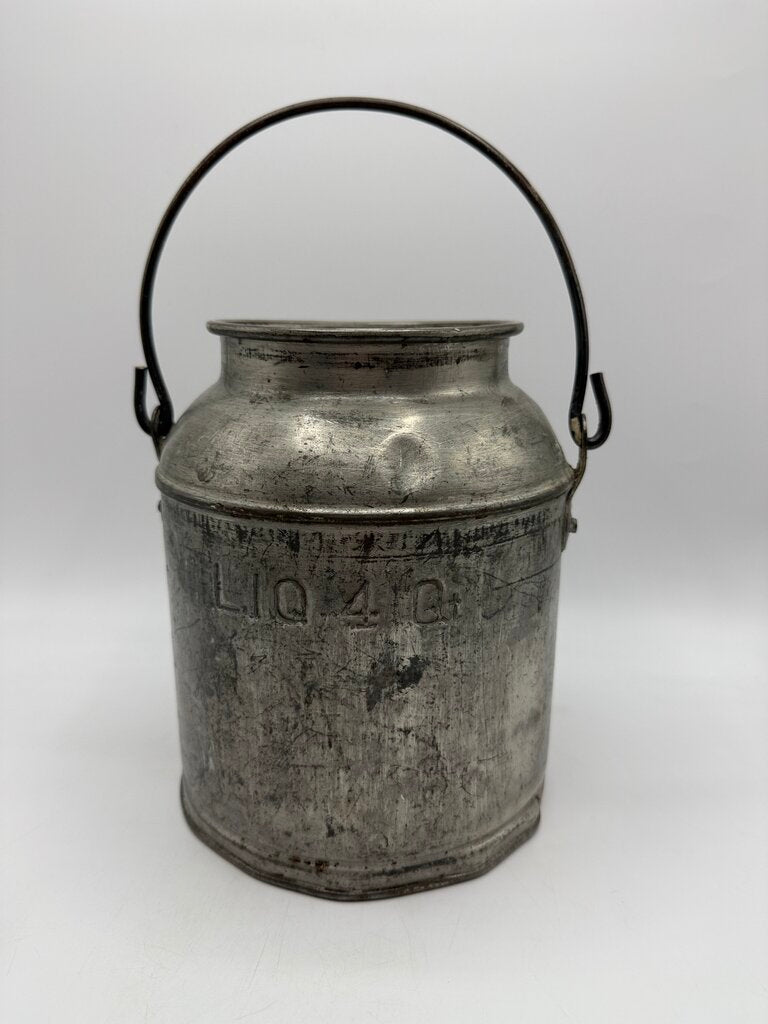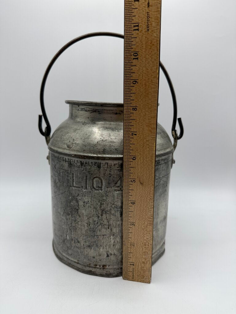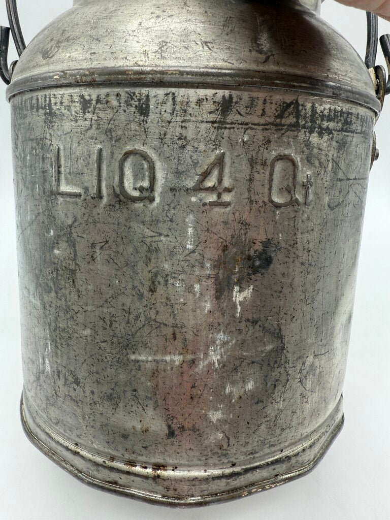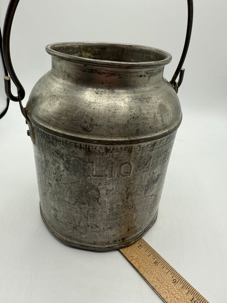 Vintage metal Milk Jug with handle, no lid, 4 quart size. Measures 8.25” tall, 5” in diameter opening and 6.75” in diameter base. Front side reads LIQ 4 QT.. light marks in metal from age and use. No holes in bottom.