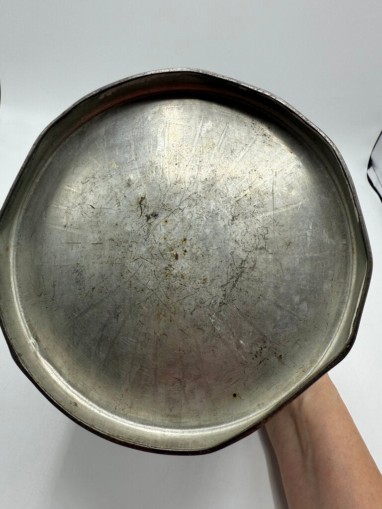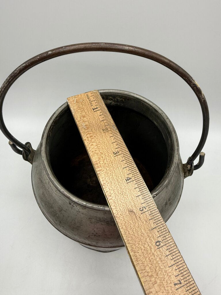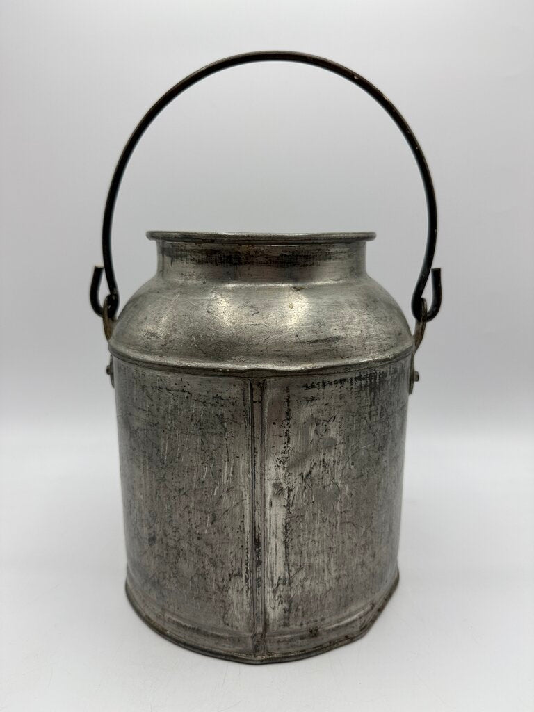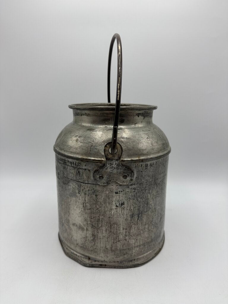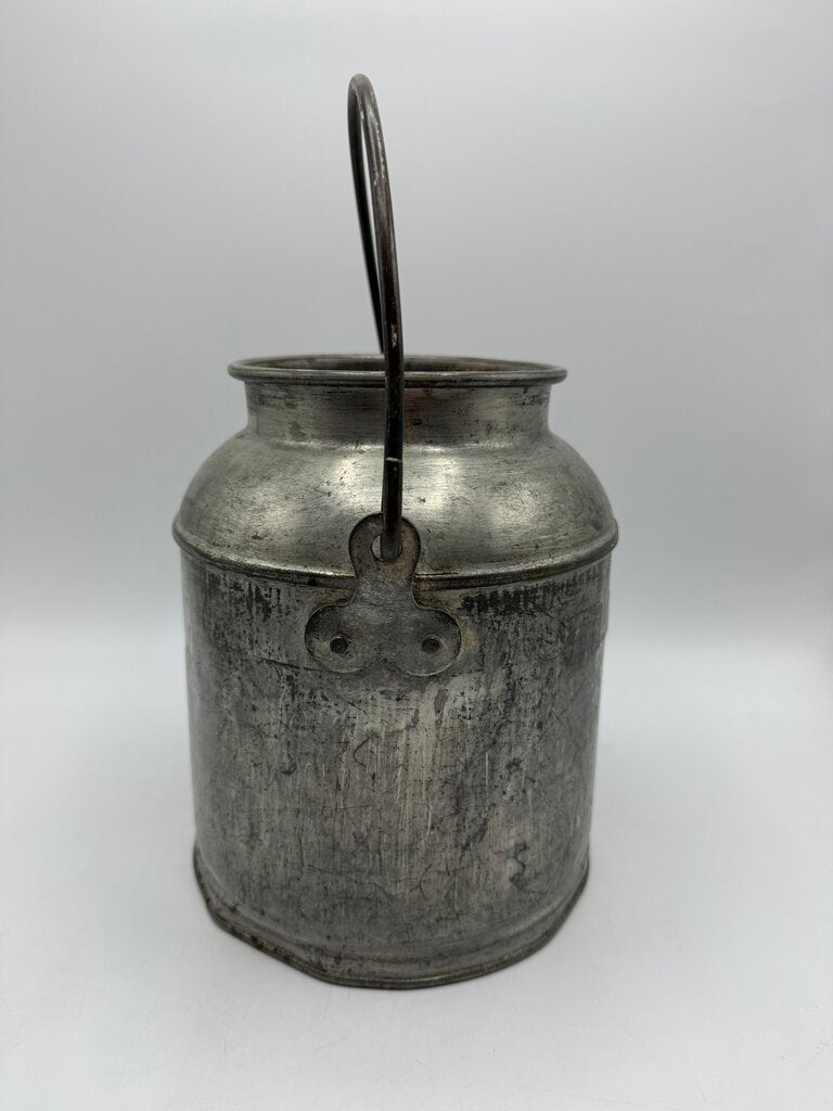 Vintage metal Milk Jug with handle, no lid, 4 quart size. Measures 8.25” tall, 5” in diameter opening and 6.75” in diameter base. Front side reads LIQ 4 QT.. light marks in metal from age and use. No holes in bottom.
