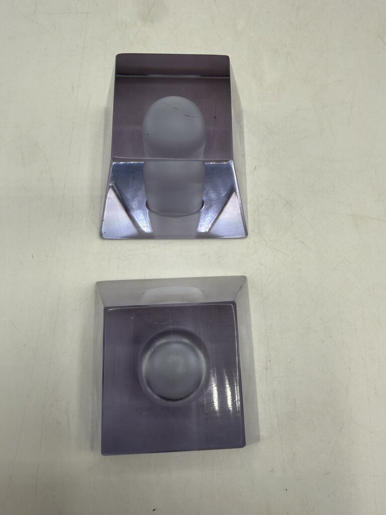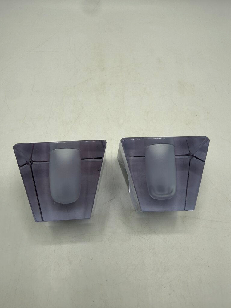 Vintage set of 2 matching heavy crystal glass candlestick holders in an obelisk style shape. The glass is clean and a light lavender color. The top measures 2.5” x 2.5” inch square and slant down to a 1 7/8” x 1 7/8” inch square base. The receptacle hole to hold your candle is 3/4” in diameter. They stand 2” tall and weigh 1 lb. 5 ounces. A few light marks from use, no chips or cracks. Very unique and attractive at to enhance any room of your home.