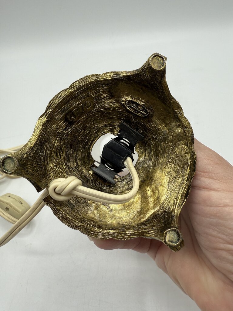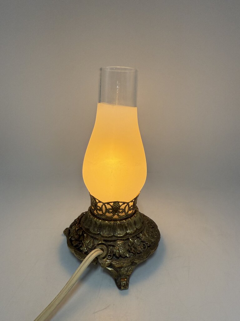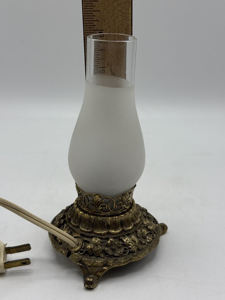 RARE Matson K770 Signed Hollywood Regency Gold Small Hurricane Accent Light Measures 6” tall with a 3.5” in diameter brass gold tone base. White electric cord with the on/off switch. Working condition, includes bulb. Charming accent light.