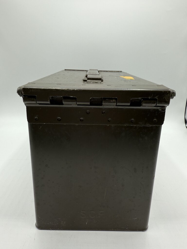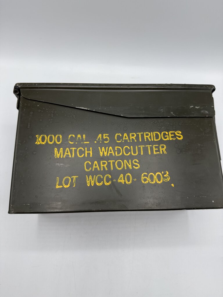 Vintage Military Metal Ammo Box. 100 CAL .45 Cartridges- Match Wadcutter Cartons - Lot WCC-40-6003. Good Condition. Measures approximately 12” by 7.5” by 5.5”.