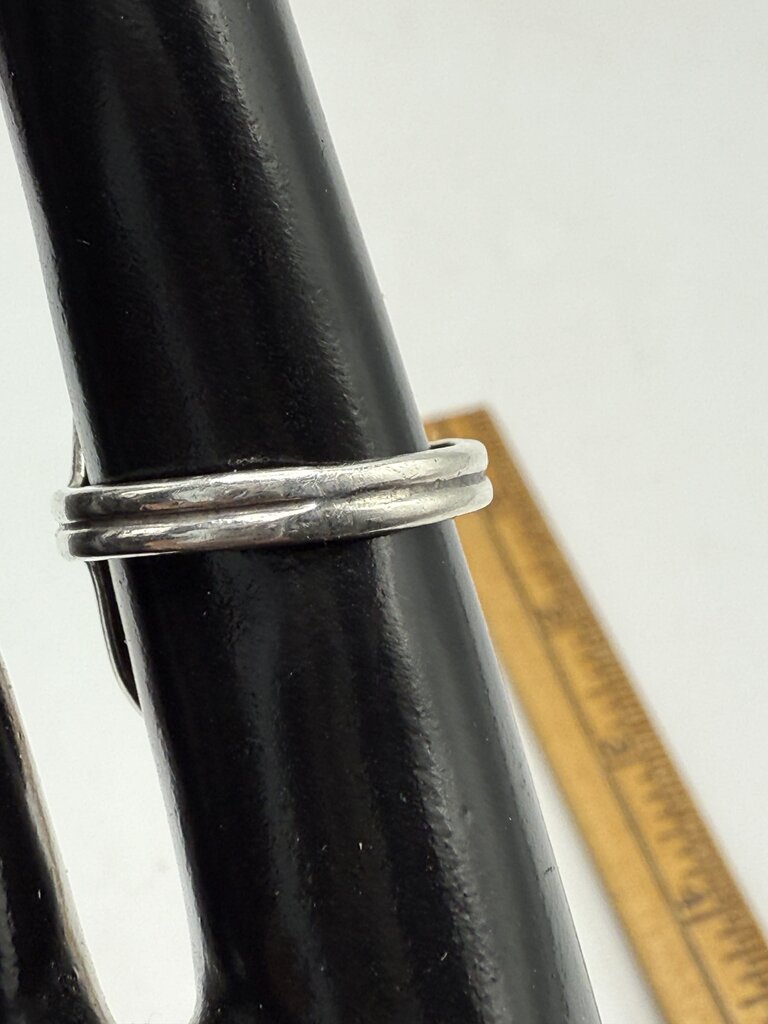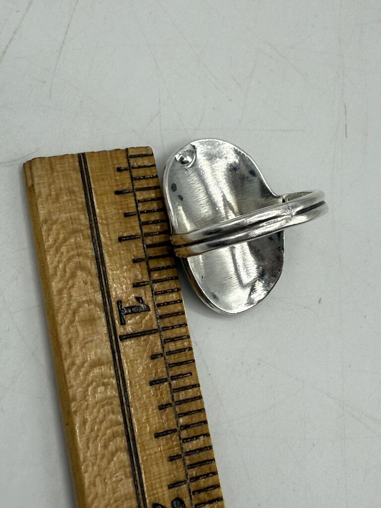 Vintage sterling silver ring with 2 turquoise stones, 1 coral stone and a flower set in an oval style setting. Oval setting measures 1” in length by 3/4” wide. Estate item, size 7.25, band was resized by original owner. Hallmarked on inside of band sterling.