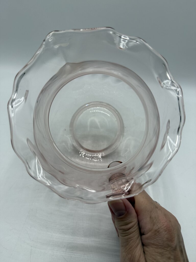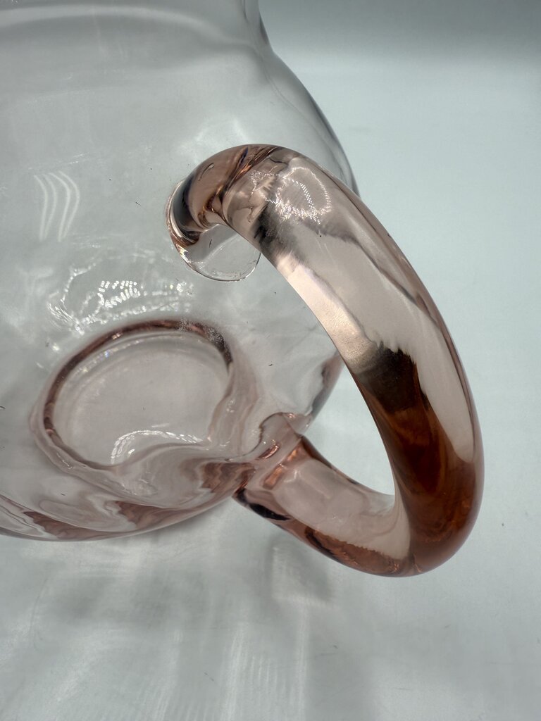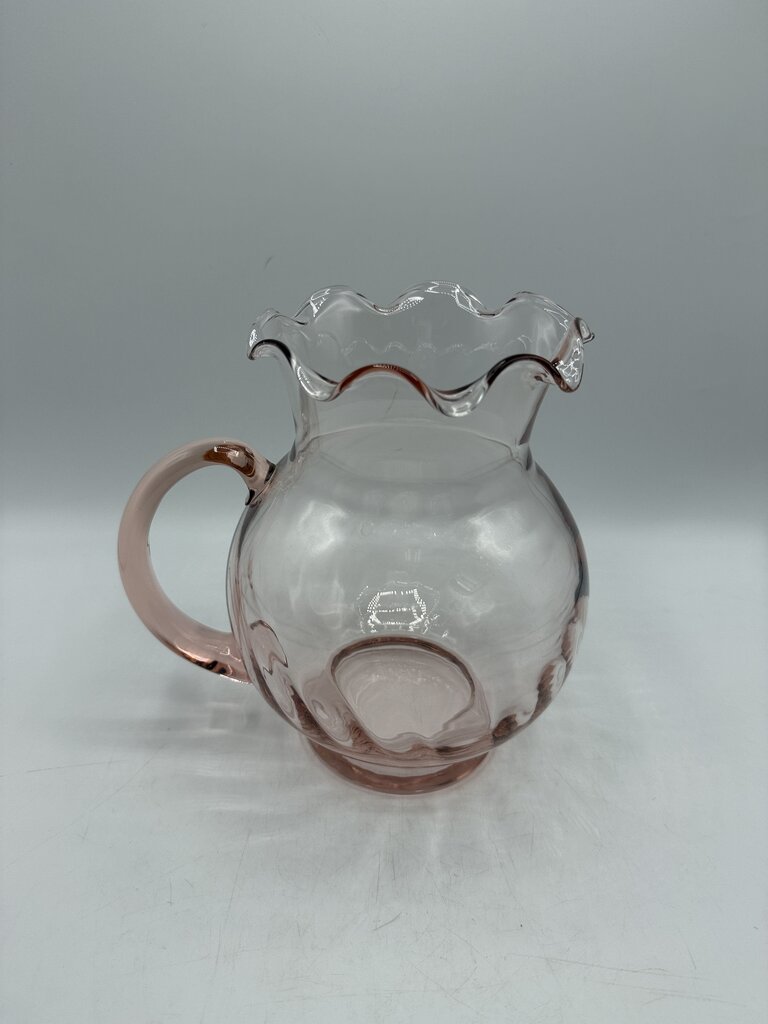 Unique vintage pink optic glass water pitcher with a ruffled edge opening. Stands 8.5” tall with a 5” opening. No chips, cracks or cloudiness in glass. There are two lines in glass from manufacturing.