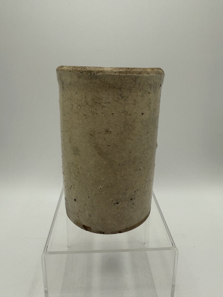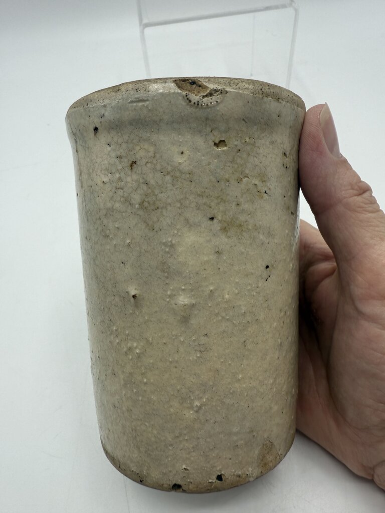 Antique primitive small stoneware crock with a beige salt glaze. Stands 5” tall and 3” in diameter. Lots of character from age.