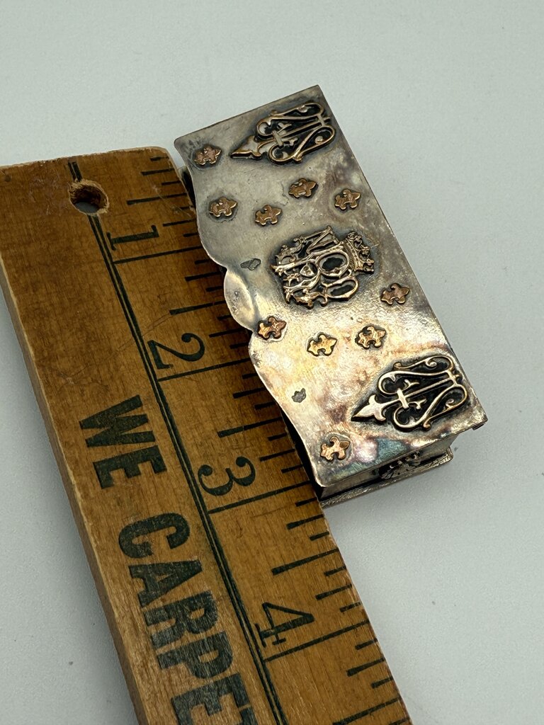 Unique estate item, this silver plate postage stamp box or pill box measures 3” x 1.25” and .75” deep. Box lid has the raised crest letters of N R D in center complimented by two harp like raised designs on either side. Some wear of silver plate. One small dent on front of box.
