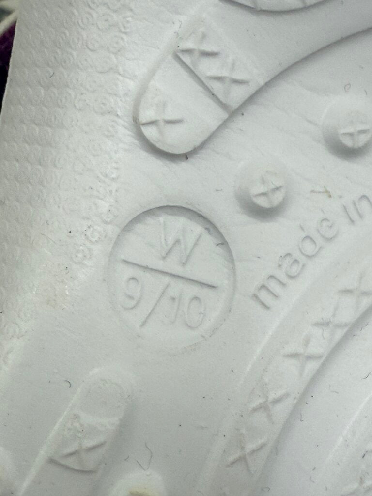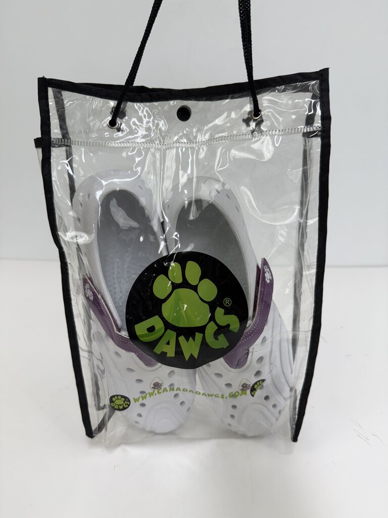 Estate item Dawgs Womens slip-on clog style shoe in white with purple Velcro strap in size 9-10. In original storage bag, no wear on bottom of shoes. Light weight. From Canada Dawgs brand.